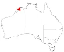 It is native to an area in the Kimberely, region of Western Australia where it is commonly situated in areas of sandstone or dolerite growing in skeletal sandy soils.[2] It is mostly found on the Bonaparte Archipelago and parts of the nearby mainland and also off-shore including on Heywood Island and Bigge Island as a part of Eucalyptus woodland communities.[3]
