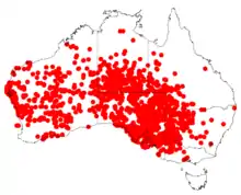 It is found in the hottest and driest climates of Australia with rainfall of less than 200mm and survives light frost.[13] It is an indicative species in sand plain mulga shrublands[16] and was used in an emissions bioassay at Olympic Dam.[18]