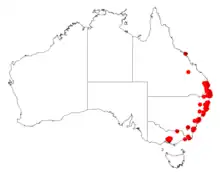 The plant is usually situated near the coast and is found as far north as Nambour and Nerang in south-eastern Queensland extending down the south coastal areas of New South Wales to around Batemans Bay. It is often found to inhabit the borders of rainforests[2] or in wet or dry sclerophyll forest communities where it is often found in gullies growing in sandy to clay soils.[1]