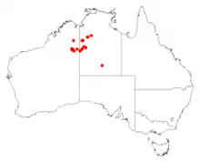 It is native to an area in the Northern Territory and the Kimberley and Goldfields-Esperance regions of Western Australia and is commonly situated along the margins of lakes that are periodically flooded growing in sandy or loamy soils.[2] The range of the plant extends from around Gregory Salt Lake in the west through to around Nongra Lake in the Tanami Desert in the east where it is usually a part of low open forest or woodland or open scrubland communities.[1]