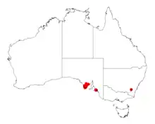It is found on the southern Eyre Peninsula and has a disjunct population near Finniss in the south Lofty region. It mainly grows in sandy or hard alkaline soils, in open scrub or woodland.[6]