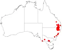 It is found in northeastern New South Wales from around Uralla in the south stretching north into southeastern Queensland. It is often a part of dry sclerophyll forest and woodland communities and grows in sandy and skeletal soils over and around granite.[1]