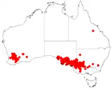 It is native to southern areas in South Australia and Victoria as well as an area in the Wheatbelt and Goldfields-Esperance regions of Western Australia.[2] It is also found in south eastern parts of South Australia, eastern parts of Victoria and south eastern parts of New South Wales.[3][4]
