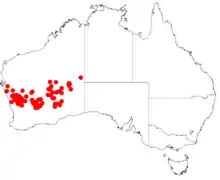 A. sibina is native to a large area in the Mid West, Goldfields and Wheatbelt region of Western Australia where it is often situated on flats, sand plains and rocky hills growing in gravelly, yellow or red sandy soils or loamy soils over laterite.[3]