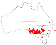 It is endemic to south eastern South Australia, central and eastern New South Wales and north eastern Victoria where it is found on plains and dunes growing in sandy to loamy soils as a part of mallee communities.[3]