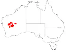 It is native to a small area in the Mid West and Goldfields regions of Western Australia where it is usually situated along drainage lines, on plains and on rocky hills.[1] It has a limited range to the south west of Meekatharra from around Belele Station that extends about 120 km (75 mi) to around Neds Creek Station in the north east and 120 km (75 mi) to the south east of Meekatharra.[2]