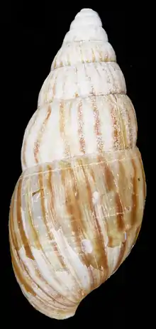 The somewhat thin and fragile shell is small compared to what is known from the other achatinids in southern Africa, its length/height is less than 45 mm with about 7½ whorls. (This description is in contradiction to Connolly (1925),[3] who probably attributes a wrongly identified shell 63.2 mm long to this taxon – a statement not repeated in his 1939 monograph.[2]) The length is always more than two times the maximum diameter, which is situated at about the level of the apex of the aperture.[2] The length of the aperture is always less than half that of the shell; the length of the last whorl in front view is always under three quarters of the total length. The apex is comparatively blunt. The whorls are hardly convex, including the body whorl.[2] The aperture is fairly narrow (greatest width just under the middle) with a thin outer lip; the columella is white, short and narrow, concave with a slight twist, obliquely truncate close to the base. The nepionic whorls are wrinkled and granulose, though always worn in the material studied.[2] The sculpture consists of regular and close wrinkles resulting in a reticulate-granulate pattern, very prominent below the sutures but well visible on all whorls; in addition there are very faint growth striae.[2] All specimens exhibit a close and fine zebra pattern with irregular, orange-brown flames on a yellowish-brown background; there is a very thin and deciduous periostracum.[2] On the whole this seems to be a well-defined taxon because of the size, shape and sculpture of the shell.[2]