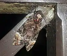 Acherontia lachesis, the greater death's head hawkmoth or bee robber, is a large (up to 13 cm wingspan)[1] sphingid moth found in India, Sri Lanka and much of the Oriental region. It is one of the three species of death's-head hawkmoth genus, Acherontia. The species was first described by Johan Christian Fabricius in 1798. It is nocturnal and very fond of honey; they can mimic the scent of honey bees so that they can enter a hive unharmed to get honey. Their tongue, which is stout and very strong, enables them to pierce the wax cells and suck the honey out. This species occurs throughout almost the entire Oriental region, from India, Pakistan and Nepal to the Philippines, and from southern Japan and the southern Russian Far East to Indonesia, where it attacks colonies of several different honey bee species. It has recently become established on the Hawaiian Islands.[2]