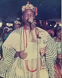 Charles Oladele Akande Ibitoye, was the thirty third traditional ruler (king) or Olomu of Omu-Aran from 1993 until his death in the year 2017. He was born into the Ruling House of Ijawusi of Ikoja Compound (28 October 1953 - 30 November 2017).[1] He took the regnal name Adogbajale-bi-ileke II.[2] Omu-Aran, which is the Head Post of Igbomina land, a town in the Nigerian state of Kwara. It originated from Ile-Ife and is the local government headquarters of the Irepodun local government.[3] He was appointed on the 1st February 1993, crowned on 19 February 1993 and was presented a first class Staff of Office on the 8 May 1993 by Mohammed Sha'aba Lafiagi, Executive Governor of Kwara State, in a ceremony attended by dignitaries from across the globe.[4]