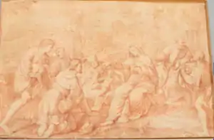 This piece, mistakenly claimed to be Raphael's Adoration of the Shepherds is 359 millimetres (14.1 in) by 502 millimetres (19.8 in), on paper, executed in red-chalk on an underlying metal point sketch. It has a collector's stamp in the upper right corner, which indicates that it was once part of a collection donated to the library of Urbania, region of Marche, Italy in 1667 by Count Bernardino Ubaldini. The Collezione Ubaldini consisted of a large number of drawings and prints of varying quality. The custodians of the library at the time, the religious order of the Caracciolini, pasted the drawings into two different books; Baldus de Ubaldis' Consilia from 1490, and Alexander Imolensis' Consilia, Lione edition from 1549. These two volumes are preserved, although the collection has been dismantled.[3] The drawing was not part of Collezione Ubaldini during the great inventory of 1837. If Raphael's Adoration of the Shepherds drawing had been a part of the collection it is not known when or why it was separated.