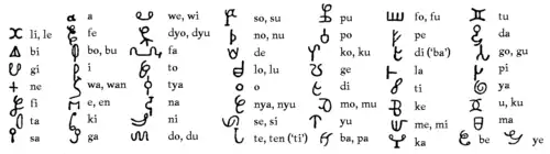 The origins of many of the letters are obscure, though several appear to be acrophonic rebuses, with many of these being symbols from Africa.[1] Examples of rebuses include a curl with a dot in it representing a baby in the belly (in Ndyuka, a abi beli, lit. "she has belly", means "she's pregnant"), which stands for [be]; two hands outstretched to give (Ndyuka gi) stand for [gi]; iconic symbols for come (Ndyuka kon) and go to represent [ko] or [kon] and [go]; two linked circles for we stand for [wi], while [yu] is an inversion of [mi], corresponding to the pronouns you and me; letters like Roman numerals two and four are [tu] and [fo]. (which would be like writing "2 4get" for 'to forget' in English.) [ka] and [pi] are said to represent feces (Ndyuka kaka) and urine (pisi). A "+" sign stands for [ne] or [nen], from the word name (Ndyuka nen), derived from the practice of signing one's name with an X. The odd conflation of [u] and [ku] is due to the letter being a pair of hooks, which is uku in Ndyuka.[2] The only letters which appear to correspond to the Latin alphabet are the vowels a, o, and maybe e, though o is justified as the shape of the mouth when pronouncing it.[3]