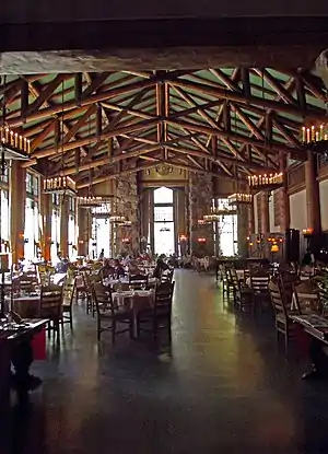 The Grand Dining Room is 130 feet long and 51 feet wide, with a 34-foot ceiling supported by rock columns, creating a cathedral-like atmosphere.[43] For fire safety reasons, the wood beams in the dining room are actually hollow and contain steel beams. The alcove window at the end of the room perfectly framed Yosemite Falls when the hotel was completed.[16] Although the dress code for the park is usually very casual, the Ahwahnee Dining Room used to require a jacket for men, but it later relaxed that tradition. Now collared shirts for men are allowed and women may wear either a dress or slacks and a blouse.[44]