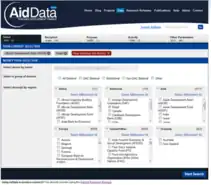 A screenshot of the AidData data interface, which allows users to search through development aid projects based on specific criteria, such as donor, recipient, project purpose and activities, and year.