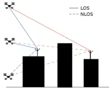 where , is the horizontal distance between the UAV and the ground node, and are the terminal heights, is the ratio of land area covered by buildings compared to the total land area, is the mean number of buildings per km2, and is the scale parameter of building heights distribution (assumed to follow a Rayleigh distribution). In some cases, it is more convenient to express the LOS probability as a function of incident or elevation angle.[2]