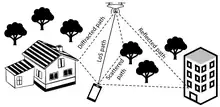 Electromagnetic waves emitted by the transmitter propagate in multiple directions. These waves interact with the environment via different propagation phenomena before reaching the receiver. The figure below demonstrates how processes like specular reflection, diffraction, scattering, and penetration, or a combination thereof, can play a role in wave propagation.[3] It's also important to consider the potential obstructions in the signal's path.