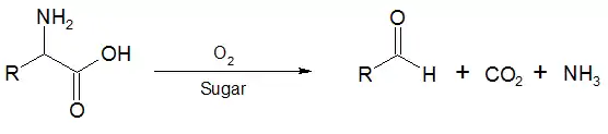 In the first reaction, an α-amino acid is oxidised and undergoes decarboxylation to give an aldehyde at the former α position by heating with oxygen in the presence of a reducing sugar.[1][2][3] This reaction is useful for preparing dichlorophthalimido derivatives of peptides for mass spectral analysis.[4]