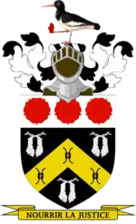 - Arms: Sable on a Chevron Or between three Fleeces Argent three Millrinds Sable on a Chief Argent three Roses Gules.
