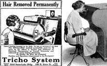 Geyser's Tricho machine which removed unwanted hair through X-rays was responsible for causing thousands of women sores, tumours and cancer.[4] Geyser sold his Tricho machines through Tricho Sales Corporation in New York City.[5] By 1925, his Tricho machines were leased to more than 75 beauty salons throughout the United States where woman would receive an average of 20 X-ray treatments on their cheeks and upper lips to permanently remove surplus hair.[6] He is estimated to have had 200,000 clients at his New York Clinic.[6]