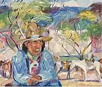Krehbiel had associations and exhibitions with the other artists of the Santa Fe Art Colony—and the Taos Society of Artists—such as George Bellows and Gustave Baumann (exhibition in McPherson, Kansas, 1918), and Bror Julius Olsson Nordfeldt, Marsden Hartley, and Sheldon Parsons (exhibition in El Paso, Texas, 1920).[20][21] Other notable artists that Krehbiel exhibited with during this period include William Victor Higgins, Ernest L. Blumenschein, John French Sloan, Raymond Jonson, and Stuart Davis.[5][17]