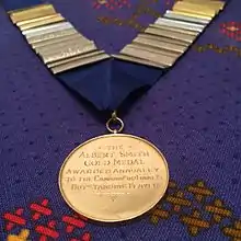 The Albert Smith Memorial Medal is the award given to the Man of the Match in the final of the Camanachd Cup,[1] the blue riband trophy of the sport of shinty. It has been presented every year since 1972 by the Smith family of Fort William in honour of Albert Smith Sr. (Born in 1888, Lochuanagan, Fort Augustus.) The widow of his only son, John Victor Smith, currently presents the medal. Albert Sr.'s grandson, Victor Smith is a former player for Fort William Shinty Club but never won the medal despite featuring as a key player in several Fort William wins. Victor Smith currently coaches Fort William Shinty Club along with his cousin Adi Robertson. Victor's son, John Victor Smith, plays full forward for the Fort.