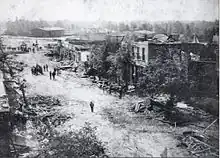 At about 4:10 p.m. on April 24, 1908, the city was virtually wiped out by a tornado that became commonly called "The Great Cyclone", or "The Cyclone of 1908".[8] The storm is believed to have killed 35 people across northeastern Alabama, including 15 in Albertville.[9] Relief was largely delivered by railroad, particularly from the nearby city of Gadsden. Trains from Gadsden transported doctors, nurses, and the Queen City Guards, the Alabama militia company based in Gadsden. The commander of the latter, future Gadsden mayor and Col. R.A. Mitchell, reported in a dispatch to Governor B.B. Comer: