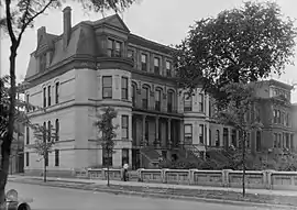 Aldine Square was built in 1874.[1] It was constructed by U.P. Smith.[2] The neighborhood was bounded by Vincennes Avenue on the east, Eden Avenue on the west, and 37th and 38th Streets on the north and south.[1] It consisted of 42 houses built of brick and limestone that surrounded a park with a pond in it,[1] and was originally paved with cedar blocks.[2] Houses in the neighborhood carried an "Aldine Square" address.[1] In 1877 the Chicago Tribune referred to it as "the most charming of all the beautiful places of residence in the city."[1] Its elegance was considered to have peaked in the 1880s.[2]