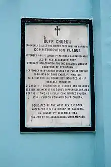 Duff hoped that through a western education in a time of enlightenment, Indians would be able to see the flaws in their religion and be compelled to convert to Christianity, but he did not consider the resilience of the Hindu religion and his efforts proved to be fairly unsuccessful on the broader scale.[21] Educations of the Christian bible was accepted by Hindus because they were confident in their own religion and were not worried that their children would lose their faith. Hinduism was not only a religion but a culture, and the occupation of the British and their ideas was not drastic enough to change this. Because Alexander Duff was regarded well, his character served as a model to his students and friends and his teaching did eventually lead to some reformist movements within Hinduism. In fact, Duff's work led to the acceptance of more Indians into public official positions in government.[21] This experience was critical to the transitional Indian government after Independence in 1947. A Church was established in 1848 and named as Duff Church in 1910 in memory of Alexander Duff.[22] Another church, in Kirkmichael, Perth and Kinross, Scotland, is named Duff Memorial Church in his honour.[23] Duff attended primary school in the village.[24]