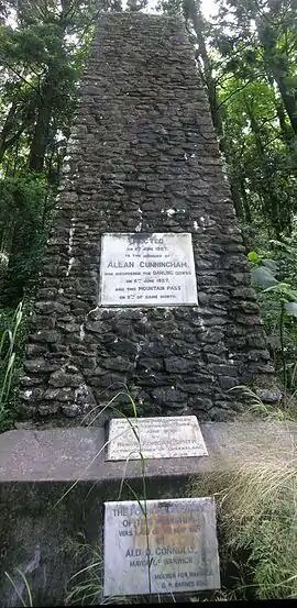 Cunningham returned to the Moreton Bay penal colony in 1828, setting off from Brisbane with Patrick Logan, Charles Fraser and five men to find Mount Warning and to establish the route to Cunningham's Gap which he did, on 24 July.[5] The peaks on either side of the gap were also named, Mount Cordeaux and Mount Mitchell. After exploring the McPherson Range area, Cunningham travelled on the south side of the Gap whereas the highway today runs further north, through the gap, from the small township of Aratula. Spicer's Gap which runs parallel to Cunningham's Gap was actually the pass first identified by Cunningham in 1827.[11] After its rediscovery in 1847, Spicer's Gap was used as a stagecoach route. In 1829, Cunningham explored the Brisbane River.