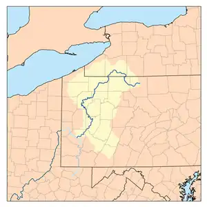 The river is approximately 325 mi (523 km) long, running through the U.S. states of New York and Pennsylvania.[11] It drains a rural dissected plateau of 11,580 sq mi (30,000 km2) in the northern Allegheny Plateau, providing the northeasternmost drainage in the watershed of the Mississippi River. Its tributaries reach to within 8 mi (13 km) of Lake Erie in southwestern New York.