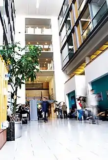 The older part of MBS, called "MBS West" is part of the University Precinct Centre complex on the southwest corner of Oxford Road and Booth Street West. The building houses lecture and conference suites and restaurant facilities including a 101-room hotel that is opening in 2017. It is also the home of the MBA programme. The complex was designed by Hugh Wilson and Lewis Womersley and dates from the 1970s.[31][32] The newer part "MBS East" lies on the northeast corner of Oxford Road and Booth Street East. It was completed in 1997 at the time when the UMIST departments co-located to form the Federal School.[3] The building cost £7m and was designed by London architects ORMS. MBS East currently houses undergraduate services and some of the Research Centres of MBS.