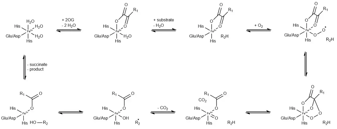 - 1 2 3 4 Hausinger RP (January–February 2004). "Fe(II)/α-ketoglutarate-dependent hydroxylases and related enzymes". Crit. Rev. Biochem. Mol. Biol. 39 (1): 21–68. doi:10.1080/10409230490440541. PMID 15121720. S2CID 85784668.