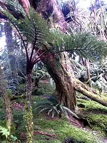 Alsophila brevipinna, synonym Cyathea brevipinna,[1] is a species of tree fern endemic to the higher parts of Mount Gower (875 m) on Lord Howe Island, where it grows in exposed areas at an altitude of about 790 m. The trunk is erect and may reach 3 m in height. It is often covered with reddish brown scales and stipe bases. This species may produce stolons at ground level. Fronds are tripinnate, densely crowded, and up to about 3 m long. The stipe is brown and sometimes warty after scales fall off. The scales are long, glossy dark brown, with a distinctly narrow apex and fragile paler edges. Sori are attached to deeply divided fertile pinnules that may uncurl over the sori. Indusia are firm and large. A. brevipinna is a stunted plant with short pinnae.[2]