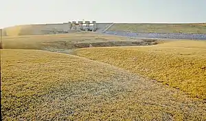 Alum Creek Dam was constructed between 1970 and 1974 on Alum Creek, a tributary of Big Walnut Creek, which drains into the Scioto River. The dam is a rolled earth-fill embankment 10,000 ft (3,000 m) in length with a maximum height of 93 ft (28 m). The spillway is located high on the right abutment with the raceway dropping off in front of it to the stilling basin below. Control is provided by three 34 ft (10 m) by 25 ft (7.6 m) tainter gates supported by 8 ft (2.4 m) wide concrete piers resting on concrete ogee sections. The ogee sections have a crest elevation of 878 feet (268 m) and are founded at 839 feet (256 m) elevation.