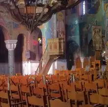 The ambon or ambo (Greek: ἄμβων, meaning "pulpit"; Slavonic: amvón) in its modern usage is a projection coming out from the soleas (the walkway in front of the iconostasis) in an Eastern Orthodox, Oriental Orthodox and Eastern Catholic church. The ambon stands directly in front of the Holy Doors.[1] It may be either rounded or square and has one, two, or three steps leading up to it.