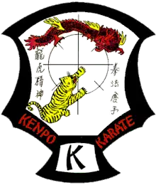 The writing acknowledges the art's Eastern roots. The characters on the right of the logo are 拳法 ("Law of the Fist", i.e. Kenpo) and 唐手 ("Tang/Chinese Hand", i.e., Karate. (The latter is now replaced by 空手 or "Empty Hand" in Japanese Karate.) The characters on the left translate to "Spirit of the Dragon and the Tiger".