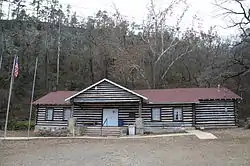 The American Legion Post No. 121 is a historic social hall on Legion Hut Road in southern Paris, Arkansas. It is a single-story L-shaped structure, built out of notched logs on a stone foundation. The logs are painted brown, and are mortared with white cement. It has a gabled roof with exposed rafter ends. A gabled porch shelters the front entrance, supported by square posts set on concrete piers faced in stone. The building was constructed in 1934 with work crews funded by the Works Progress Administration, and is the best local example of WPA Rustic architecture.[2]