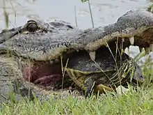American alligators are considered an apex predator throughout their range. They are opportunists and their diet is determined largely by both their size and age and the size and availability of prey. Most American alligators eat a wide variety of animals, including invertebrates, fish, birds, turtles, snakes, amphibians, and mammals. Hatchlings mostly feed on invertebrates such as insects, insect larvae, snails, spiders, and worms, as well as small fish and frogs.[91][92] As they grow, American alligators gradually expand to larger prey. Once an American alligator reaches full size and power in adulthood, any animal living in the water or coming to the water to drink is potential prey. Most animals captured by American alligators are considerably smaller than itself.[26] A few examples of animals consumed are largemouth bass, spotted gar, freshwater pearl mussels, American green tree frogs, yellow mud turtles, cottonmouths, common moorhens, and feral wild boars.[91] Stomach contents show, among native mammals, muskrats and raccoons are some of the most commonly eaten species.[93] In Louisiana, where introduced nutria are common, they are perhaps the most regular prey for adult American alligators, although only larger adults commonly eat this species.[94][93] It has also been reported that large American alligators prey on medium-sized American alligators, which had preyed on hatchlings and smaller juveniles.[95]