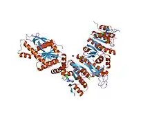 In molecular biology, the amino acid kinase domain is a protein domain. It is found in protein kinases with various specificities, including the aspartate, glutamate and uridylate kinase families. In prokaryotes and plants the synthesis of the essential amino acids lysine and threonine is predominantly regulated by feed-back inhibition of aspartate kinase (AK) and dihydrodipicolinate synthase (DHPS). In Escherichia coli, thrA, metLM, and lysC encode aspartokinase isozymes that show feedback inhibition by threonine, methionine, and lysine, respectively.[1] The lysine-sensitive isoenzyme of aspartate kinase from spinach leaves has a subunit composition of 4 large and 4 small subunits.[2]