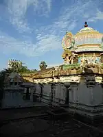 The present masonry structure was built during the Chola dynasty in the 9th century, while later expansions are attributed to Thanjavur Nayaks. The temple has a three-tiered rajagopuram (temple tower gateway) and has a moat both inside and outside its surrounding walls. There is a Saptamatrikas sculpted in a single panel and image of Tapsiviyaman. The Dakshinamurthy sculpture on the temple is unique as it is depicted with four hands - the upper right holding a bead made of Rudraksha, the upper left holding Agni (fire), the lower right holding cinmudra and lower left holding palm leaves. The temple tank associated with it is called Caturveda Tirtha, while the tree associated with the temple is Vanni. The presiding deity is Shiva in the form of Amirthakalasanathar or Amirthakadeswarar. The consort is Amirthavalli. Most of the shrines were constructed by the Medieval Cholas. There are shrines to Murugan and Ganesa. There is also a brick halls from the Thanjavur Nayak period.[2] The image of Lingothbhava is made of emerald, while the image of Ardhanarishvara is depicted with his right leg in relaxing posture. There are smaller shrines for Dhandapani Muruga in a small size and Nardana Vinayaka on the southern side. The front hall houses the Nandi Bali Peeta.[3]