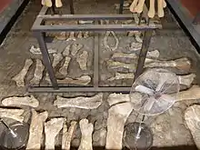 Ampelosaurus is known by abundant remains from the Bellevue site near the village of Campagne-sur-Aude in the Upper Aude Valley, in Aude department in Occitania region. It was recovered in the lower levels of the Marnes Rouges Inférieures Formation, which belong to the early Maastrichtian epoch of the Late Cretaceous Period, ~ 70 million years ago. These sediments represent an ancient floodplain with numerous river channels.[1] Historically, the dinosaurs of the Upper Aude Valley were first reported by Paul Gervais in 1877 from two vertebrae discovered in the commune of Fa. The first discoveries of dinosaur bones at Campagne-sur-Aude date back to the beginning of the twentieth century, but they remained isolated and were quickly forgotten. It was not until 1982 that dinosaurs localities of the Upper Aude Valley were rediscovered by local amateurs, Pierre Clottes and Christian Raynaud, following the accidental discovery of a fossil bone in Campagne-sur-Aude by a hunter a year earlier. Clottes and Raynaud mainly discovered caudal vertebrae and limb bones during simple surface collecting carried out at several sites around the villages of Campagne-sur-Aude and Espéraza. In 1989, the first systematic excavations carried out by professional paleontologists began on the main site, located at the Bellevue farm. Several excavation campaigns brought to light numerous bones of an unknown sauropod. This new dinosaur was named Ampelosaurus atacis by the French paleontologist Jean Le Loeuff in a preliminary description published in 1995.[1][2] Ampelosaurus is derived from the Greek αμπελος, "the vine" and the Latinised Greek saurus, "reptile". Therefore, Ampelosaurus means "vineyard lizard" after the Blanquette de Limoux vineyard. The vineyard is located on the south side of the region Ampelosaurus was found in. The specific name is based on the Latin atax, the "Aude river".[1] Only one tooth, three articulated dorsal vertebrae (the holotype MDE-C3-247), and the neural spine of another dorsal vertebra were illustrated, whereas the material known at that time also included other dorsal and caudal vertebrae, ribs, chevrons, limb bones, shoulder and pelvis bones, from several individuals.[1] Four osteoderms discovered at Bellevue and described in 1994 were also attributed to Ampelosaurus in 1995.[3][1] In 2005, Le Loeuff published a more complete description of the bones discovered since 1989 including a braincase and a right dentary.[2] In 2001 was found a relatively complete skeleton of a young adult about 10 m long, nicknamed "Eva" after the name of Eva Morvan the student who discovered the first elements.[4] Several excavation campaigns were necessary (until 2006) to extract this skeleton.[5] This specimen, which as yet to be described, includes an almost complete disarticulated skull of which only a few elements are currently on display in the Dinosaur Museum of Espéraza.[6][2] In 2007, the remains of a larger specimen were discovered, including a sternal plate, a scapula, a 1.20 m femur, a pubis, a caudal vertebra and a chevron.[5]