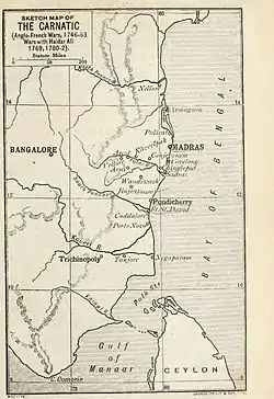 The official appointment of Ananda Ranga Pillai was delayed by a couple of years due to the stoppage of trade arising out of the outbreak of hostilities between the French and the British.[55] The British responded to the French occupation of Madras by launching an invasion of Pondicherry in July 1747.[56] This invasion launched by Admiral Boscawen ultimately failed to capture Pondicherry but hostilities soon came to an end by the Treaty of Aix-la-Chappelle.[57]