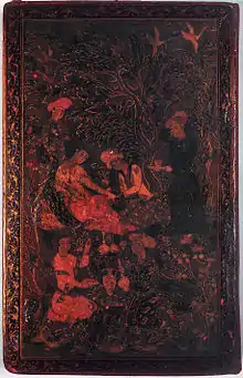 Safavid lacquer work illustrating a physician taking the pulse of a patient. From a 17th-century copy of Avicenna's Canon of Medicine. Wellcome Library, London.