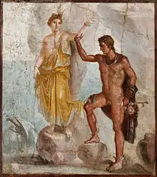 The myth of Andromeda was represented in the art of ancient Greece and of Rome in media including red-figure pottery such as pelike jars,[15] frescoes,[16] and mosaics.[17] Depictions range from straightforward representations of scenes from the myth, such as of Andromeda being tied up for sacrifice, to more ambiguous portrayals with different events depicted in the same painting, as at the Roman villa in Boscotrecase, where Perseus is shown twice, space standing in for time.[16] Favoured scenes changed with time: until the 4th century BC, Perseus was shown decapitating Medusa, while after that, and in Roman portrayals, he was shown rescuing Andromeda.[18]