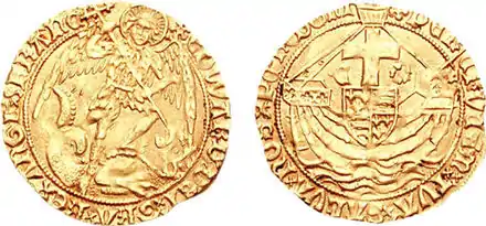 Reverse: Shows Archangel Michael fighting the dragon. In small lettering beneath the dragon, metal content, coin size and fineness are given. The design is framed by an elaborate Viking knit motif border with the island's coat of arms, the triskele, appearing at the top, above the ship's flag. The motif of Michael or a Saint slaying a dragon is found in other coins. Michael is used in Ukraine's Archangel Michael gold and silver bullion coins. Russia's Saint George the Victorious bullion coins show Saint George slaying a dragon. The United Kingdom's Sovereign gold bullion also show Saint George fighting a dragon. There have been three primary designs for the Angel. From 1984 to 1993, the Angel faced left. From 1994 to 2007, the Angel faced right. In 2008 and from 2010 to 2015, the Angel still faced right, but in a more upright position. The Angel changed back to the left facing pose starting in 2016. Some left facing coins were produced in 2014. The 2009 version of the coin had three different designs that haven't been produced before or since.