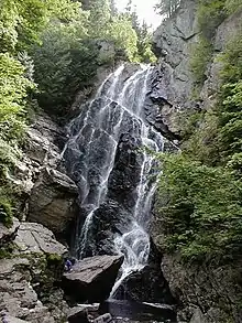 Angel Falls is a 90-foot (27 m) waterfall on Mountain Brook in Township D – northwest of Houghton – in the White Mountains of Franklin County, Maine. The "remarkably scenic"[2] Angel Falls is a set of plunging tiers totaling 90 feet (27 m) in height, and with surrounding cliffs of 115 feet (35 m) in height. Flowing out of a 25-foot-wide gap (7.6 m) in the cliff, it is thought by many to be the tallest waterfall in Maine, tied for height with Moxie Falls,[2] though this is not the case; as Katahdin Falls, also in Maine, is some 710 feet (220 m) taller.[1] Angel Falls is so named as, when the water flow is right, the falls appear as an angel.[3]