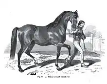 After the Napoleonic Wars, there were almost no saddle horses remaining in France. This situation was exacerbated by improvements to the roads, resulting in a large demand for carriage horses, further reducing demand for riding horses. Between 1815 and the 1850s, only the wealthy and the army continued to purchase riding horses.[26] Early in the 19th century, in Lower Normandy, breeders focused on the Carrossier Normand, the ancestor of the Anglo-Norman and the French Trotter,[4] which was mainly used as a carriage horse. When the Carrossier Normand was crossed with Thoroughbreds, a practice which likely started around 1830, the resulting mix was called the "Anglo-Norman".[3][27][28] When other local native mares were crossed with Thoroughbreds and Arabians, however, the early results were disappointing.[29] However, despite very low population numbers of riding horses, in the early 1850s, author Ephrem Houël noted a type of Norman saddle horse still extant in Le Merlerault.[30]
