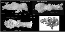 The neurobiology of ankylopollexians has been studied as far back as 1871, when a well preserved cranium (specimen NHMUK R2501[15]) discovered in September 1869 from the Wealden Group on the Isle of Wight and tentatively referred to the genus Iguanodon was described by John Hulke. He noted that due to the lesser correlation of the shape of the brain and wall of cranial cavity in reptiles, any deduction of the shape of the brain of the animal would be approximate.[16] The referral of this skull was reinforced in a later study, published in 1897. It was here inquired that the brain of the dinosaur may have been more closely associated to the cavity than that of modern reptiles, and so an endocast was created and studied.[17] This was not the first endocast of an ankylopolloxian brain, for in 1893, the skull of a Claosaurus annectens (today referred to the genus Edmontosaurus[18]) was used by Othniel Charles Marsh to create a cast of the brain cavity. Some basics remarks were made, including the small size of the organ, but interpreting minute features of the organ was noted to be difficult.[19] The 1897 paper noted the similarity of the two endocasts.[17]