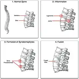 Prognosis is related to disease severity.[9] AS can range from mild to progressively debilitating and from medically controlled to refractory. Some cases may have times of active inflammation followed by times of remission resulting in minimal disability while others never have times of remission and have acute inflammation and pain, leading to significant disability.[9] As the disease progresses, it can cause the vertebrae and the lumbosacral joint to ossify, resulting in the fusion of the spine.[47] This places the spine in a vulnerable state because it becomes one bone, which causes it to lose its range of motion as well as putting it at risk for spinal fractures. This not only limits mobility but reduces the affected person's quality of life. Complete fusion of the spine can lead to a reduced range of motion and increased pain, as well as total joint destruction which could lead to a joint replacement.[48]