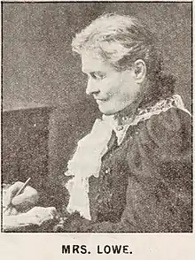 Lowe née Hopkins was born in 1834. Her father was involved with establishing universal suffrage for men in New South Wales.[3] She moved to Victoria with her husband Josiah Alexander Lowe.[4] In 1884 she helped found the Victorian Women's Suffrage Society.[5] She was known for her public speaking.[5][4] She lived to see the women of Victoria given the right to vote in 1908, but died before being able to vote in the 1911 state election.[6]