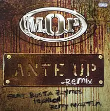 "Ante Up (Robbing-Hoodz Theory)" (rendered on digital platforms as "Ante Up (Robbin Hoodz Theory)", and also simply known as "Ante Up") is a song by American hip hop duo M.O.P. from their fourth studio album Warriorz (2000). Seen as their breakthrough single, it was released in 2000 and reached number 7 on the UK Singles Chart. A remix of the song features Busta Rhymes, Remy Martin and Teflon.[1] The remix CD includes an additional version which features Funkmaster Flex.[2]